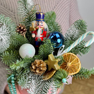 Основой композиции служит благородная хвоя нобилиса — её мягкие иголки с серебристым отливом напоминают заснеженные ветви в лунном свете. В этом миниатюрном зимнем лесу, будто из страниц любимой сказки, расположился декоративный Щелкунчик — хранитель новогодних чудес. Его нарядная фигурка с гордой осанкой и загадочной улыбкой словно обещает: «Здесь начнутся чудеса!»