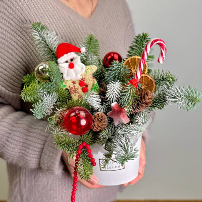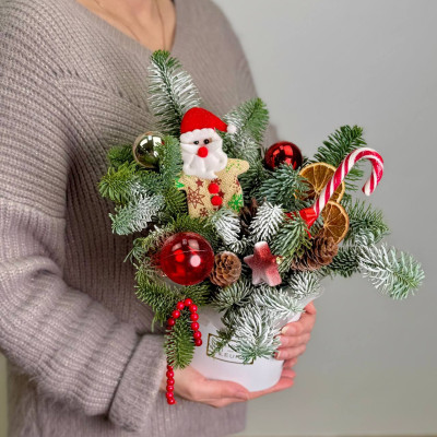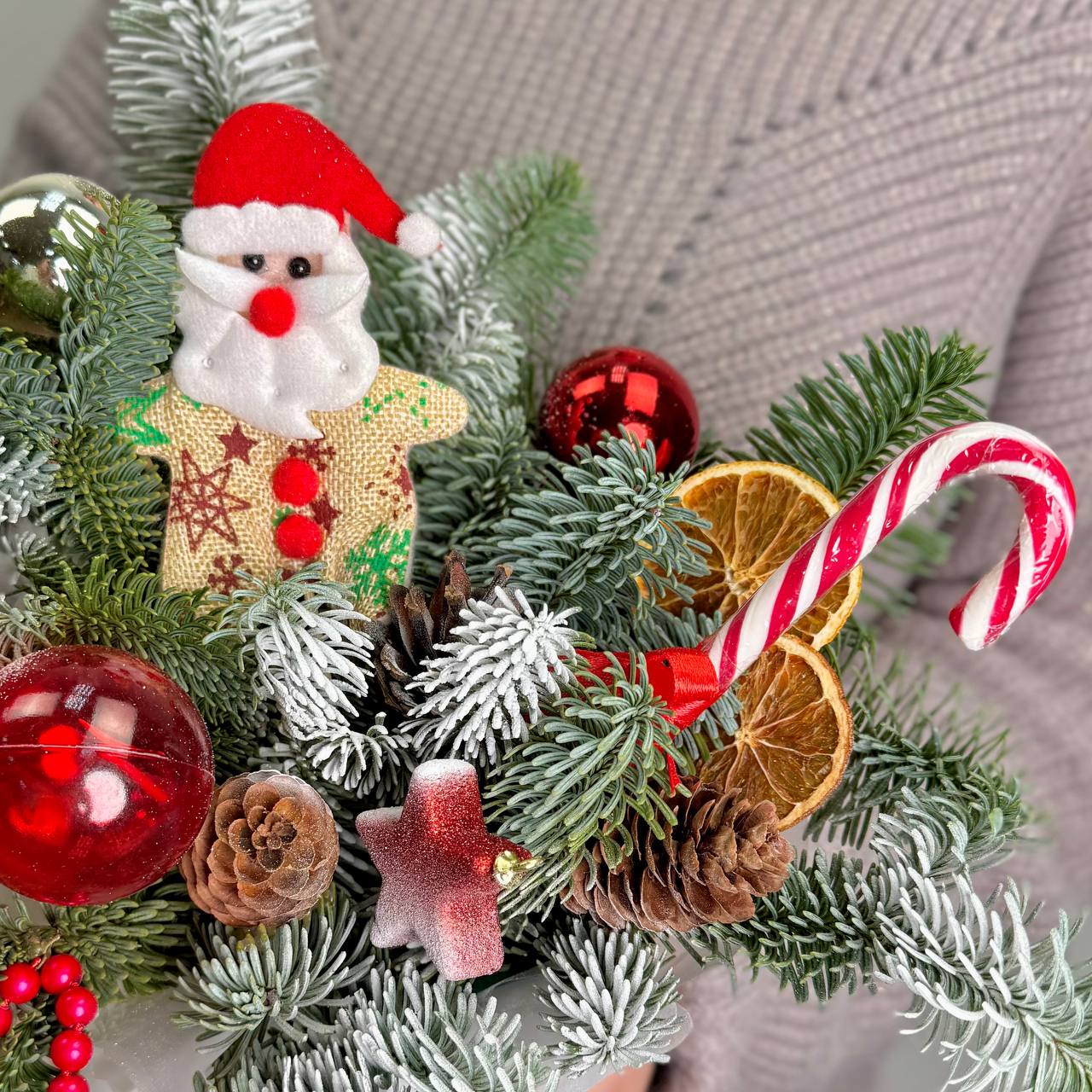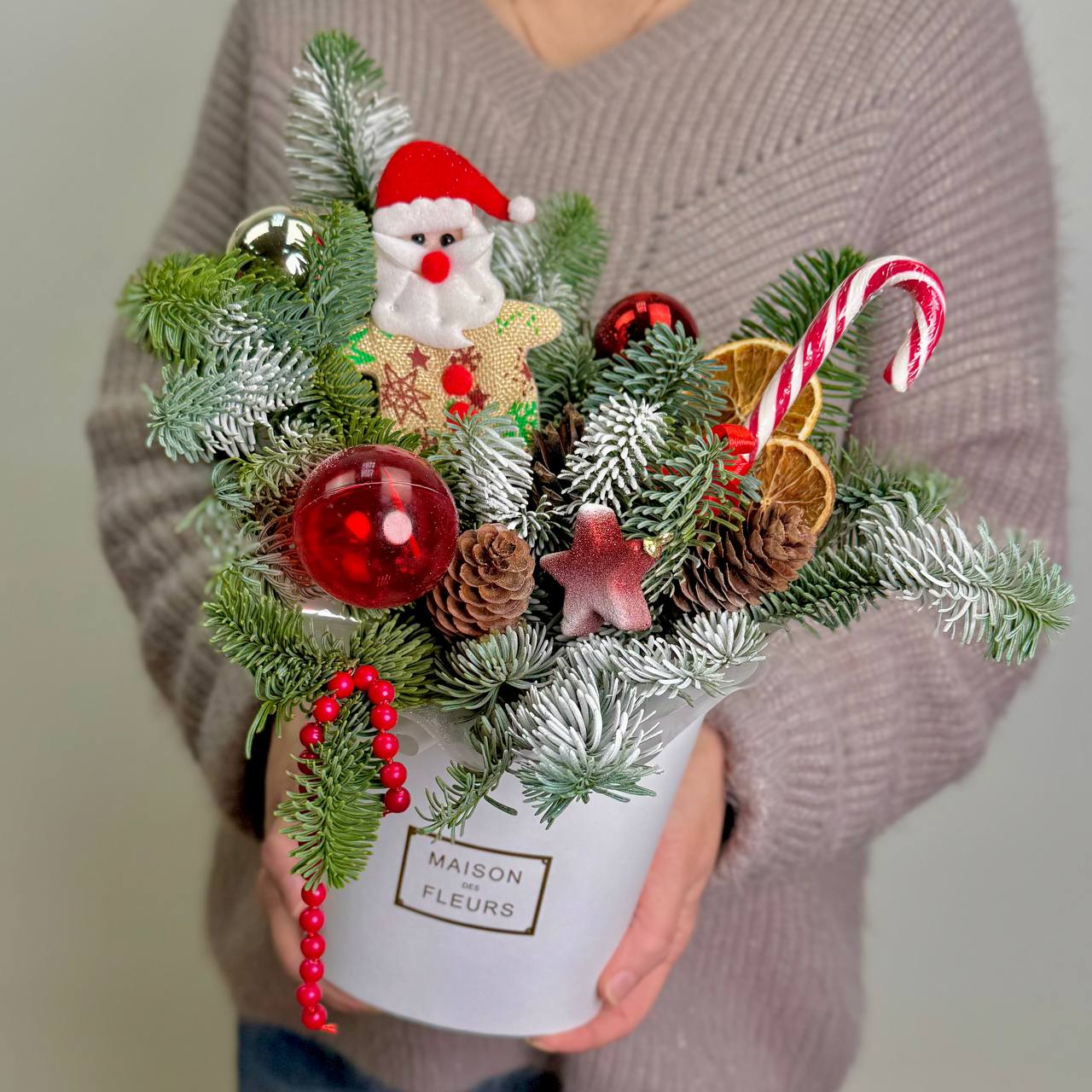 В уютном кашпо расцвела настоящая новогодняя сказка — цветочная композиция «Мини Дедушка Мороз». Словно по волшебству, здесь собрался маленький праздничный мир, где каждый элемент будто шепчет: «Скоро Новый год!»