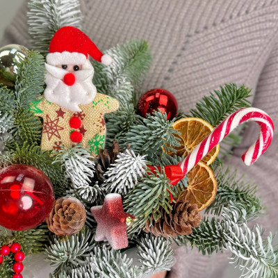 Основой композиции стали благородные ветви нобилиса. Их густая хвоя с нежным голубовато‑зелёным отливом напоминает заснеженные еловые лапы в предрассветный час. В этом миниатюрном зимнем царстве, среди пушистых ветвей, уютно расположился декоративный Дедушка Мороз — добрый волшебник, хранитель новогодних чудес. Его румяные щёчки и тёплая улыбка словно говорят: «Я уже принёс вам праздник!»